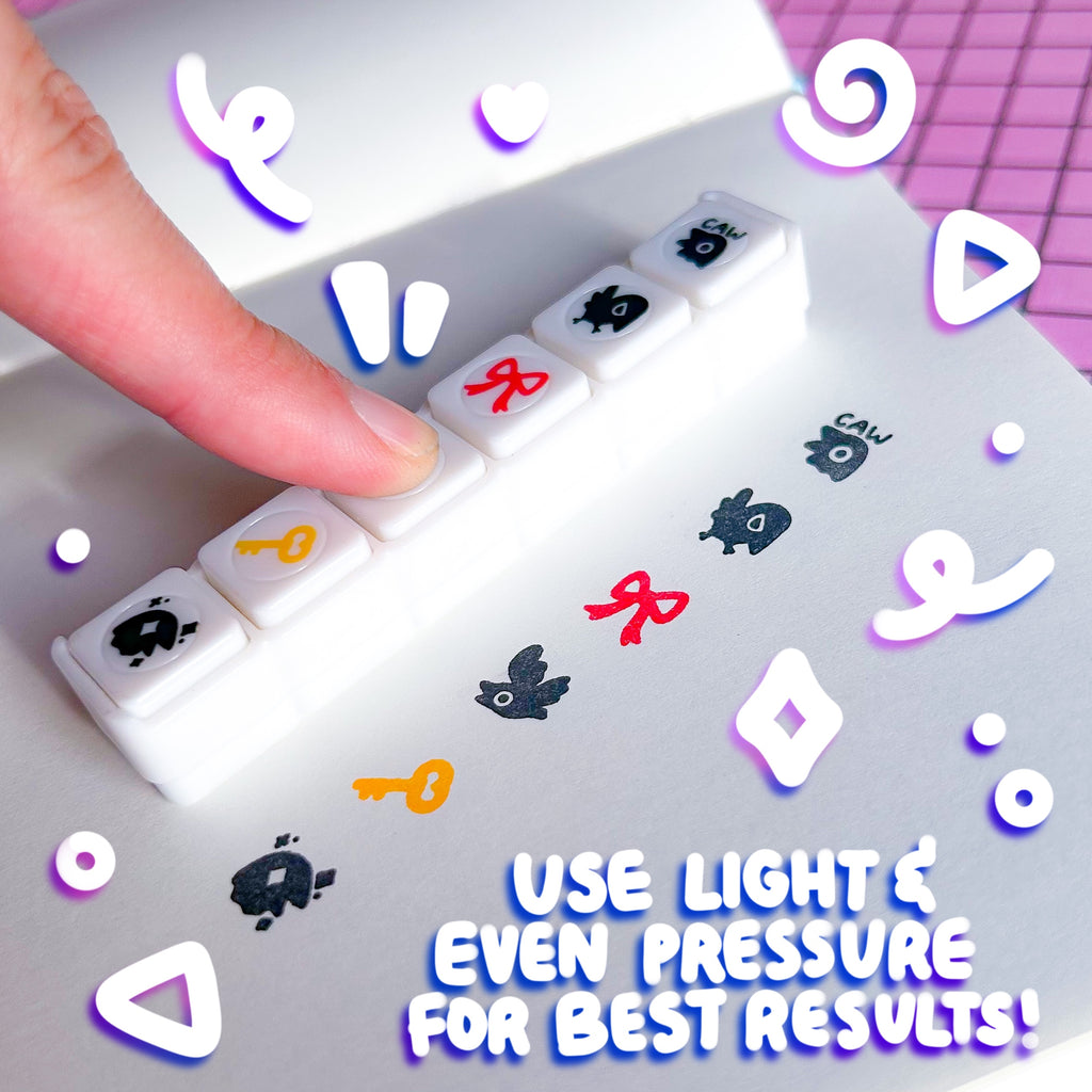 PLEASE note that these stamps are incredibly tiny! Each individual design only measures about 1 cm across. This allows for maximum portability since you can slip the whole set into your pencil case to take with you. Stamp clarity varies depending on the amount of pressure applied as well as the saturation of the pre-filled ink. We recommend a light and even pressure when using this stamp set, and have noticed that brand new sets require a lighter touch as they have more ink in the reservoir!
