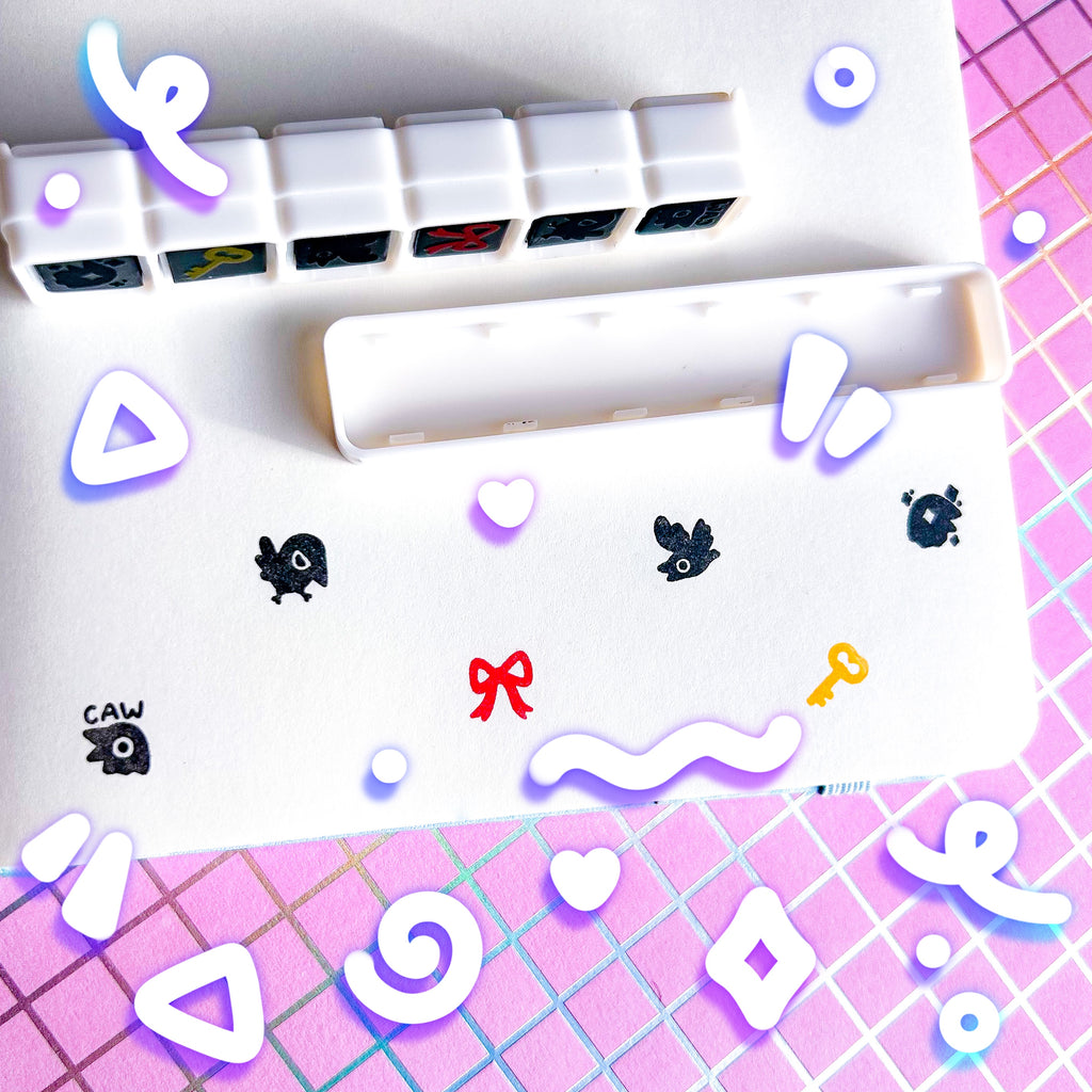 CAW! You can now satisfy your inner corvid with this set of stamps. Amidst the flying crow, raucous crow, angry crow, and shiny crow, you will also find a red bow and gold key! These stamps are all included in a single row and you can press each design individually.