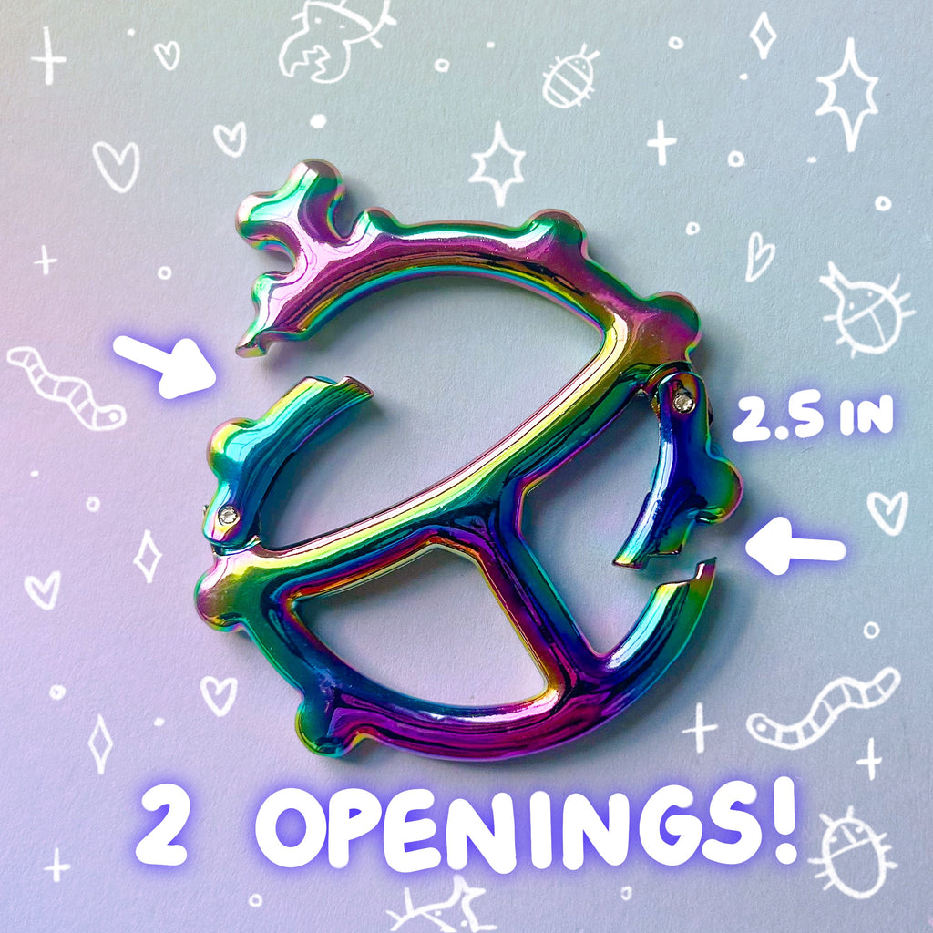 This double-hinged Scarabiner (Scarab+Carabiner) offers an iridescent pop of color and extra space to attach your trinkets and charms to! Hook it onto a strap on your bag or backpack, or hang it from a lanyard.